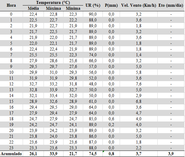 Legenda: Média = Temperatura média ocorrida no período (°C); Máxima = Valor máximo de temperatura observado no período (°C); Mínima = Valor mínimo de temperatura observado no período (°C); UR = Umidade relativa média do ar ocorrida no período (%); P = Precipitação ocorrida no período (mm); ET0 = Evapotranspiração potencial de referência (Penman-Monteith) (mm/dia).