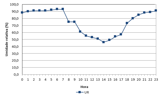 Legenda: Média = Temperatura média ocorrida no período (°C); Máxima = Valor máximo de temperatura observado no período (°C); Mínima = Valor mínimo de temperatura observado no período (°C); UR = Umidade relativa média do ar ocorrida no período (%); P = Precipitação ocorrida no período (mm); ET0 = Evapotranspiração potencial de referência (Penman-Monteith) (mm/dia).