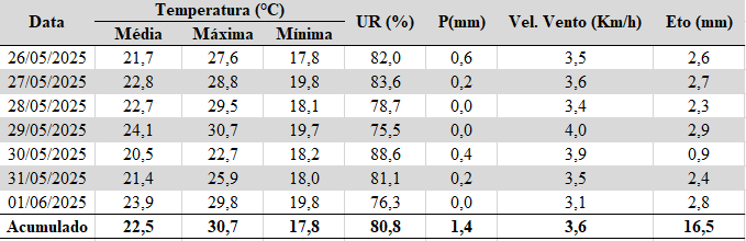 Legenda: Média = Temperatura média ocorrida no período (°C); Máxima = Valor máximo de temperatura observado no período (°C); Mínima = Valor mínimo de temperatura observado no período (°C); UR = Umidade relativa média do ar ocorrida no período (%); P = Precipitação ocorrida no período (mm); ET0 = Evapotranspiração potencial de referência (Penman-Monteith) (mm/dia).