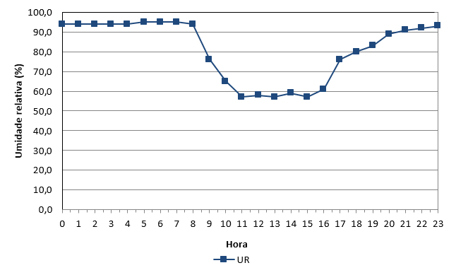 Legenda: Média = Temperatura média ocorrida no período (°C); Máxima = Valor máximo de temperatura observado no período (°C); Mínima = Valor mínimo de temperatura observado no período (°C); UR = Umidade relativa média do ar ocorrida no período (%); P = Precipitação ocorrida no período (mm); ET0 = Evapotranspiração potencial de referência (Penman-Monteith) (mm/dia).