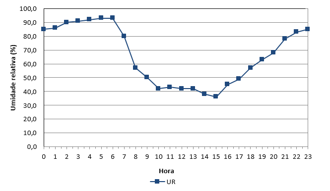 Legenda: Média = Temperatura média ocorrida no período (°C); Máxima = Valor máximo de temperatura observado no período (°C); Mínima = Valor mínimo de temperatura observado no período (°C); UR = Umidade relativa média do ar ocorrida no período (%); P = Precipitação ocorrida no período (mm); ET0 = Evapotranspiração potencial de referência (Penman-Monteith) (mm/dia).