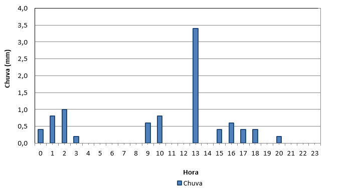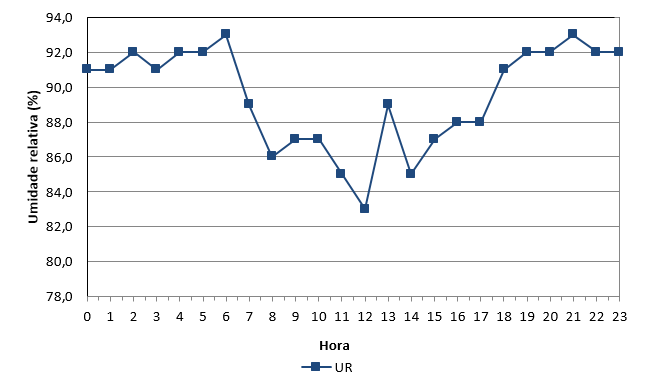 Legenda: Média = Temperatura média ocorrida no período (°C); Máxima = Valor máximo de temperatura observado no período (°C); Mínima = Valor mínimo de temperatura observado no período (°C); UR = Umidade relativa média do ar ocorrida no período (%); P = Precipitação ocorrida no período (mm); ET0 = Evapotranspiração potencial de referência (Penman-Monteith) (mm/dia).