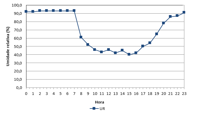 Legenda: Média = Temperatura média ocorrida no período (°C); Máxima = Valor máximo de temperatura observado no período (°C); Mínima = Valor mínimo de temperatura observado no período (°C); UR = Umidade relativa média do ar ocorrida no período (%); P = Precipitação ocorrida no período (mm); ET0 = Evapotranspiração potencial de referência (Penman-Monteith) (mm/dia).