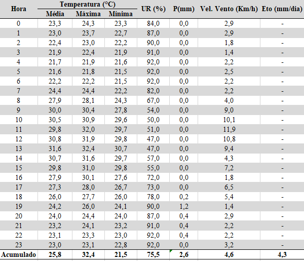 Legenda: Média = Temperatura média ocorrida no período (°C); Máxima = Valor máximo de temperatura observado no período (°C); Mínima = Valor mínimo de temperatura observado no período (°C); UR = Umidade relativa média do ar ocorrida no período (%); P = Precipitação ocorrida no período (mm); ET0 = Evapotranspiração potencial de referência (Penman-Monteith) (mm/dia).