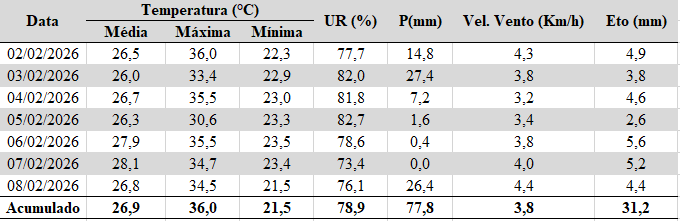 Apresentam-se os dados meteorológicos referentes à primeira semana do mês de Fevereiro de 2026.