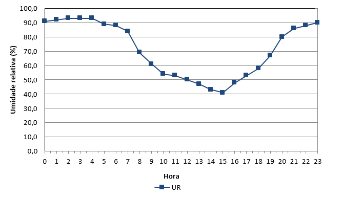 Legenda: Média = Temperatura média ocorrida no período (°C); Máxima = Valor máximo de temperatura observado no período (°C); Mínima = Valor mínimo de temperatura observado no período (°C); UR = Umidade relativa média do ar ocorrida no período (%); P = Precipitação ocorrida no período (mm); ET0 = Evapotranspiração potencial de referência (Penman-Monteith) (mm/dia).