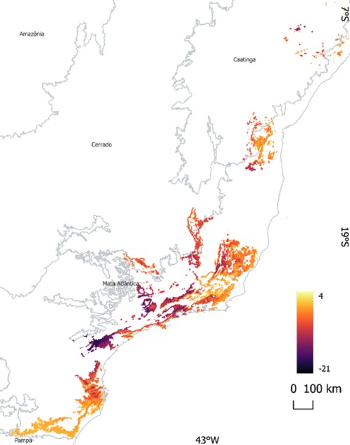 Os dados indicam que, até 2070, a redução dessas áreas climaticamente adequadas pode chegar a 36% em cenários de maior impacto climático. “Enquanto algumas espécies podem encontrar novos locais adequados ou manter sua área de distribuição, a maioria está caminhando para uma retração. As perdas mais acentuadas devem acontecer na Mata Atlântica, bioma que abriga grande diversidade e riqueza de mamíferos de montanha, enquanto os pequenos ganhos aparecem em áreas periféricas das montanhas ”, diz Loss.